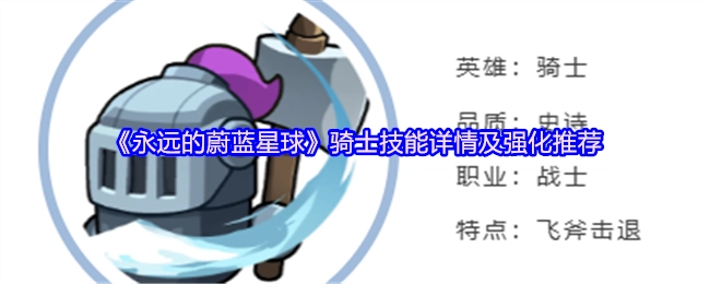 当前游戏里一共有3位战士英雄,它们分别为:骑士、卡卡、剑圣。骑士在游戏的前中期实用性极高,战士这一定位给予了骑士相当不错的输出能力。要是搭配上击退、范围增加这类词条效果,就能使怪物难以接近城墙,从而大幅提升关卡的通关概率。接下来为大家送上《永远的蔚蓝星球》骑士技能的详细情况以及强化推荐!