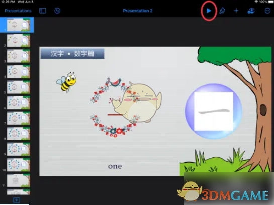 1. 启动Keynote软件,在其中选中要进行演示的幻灯片,接着点击右上角的小三角形,以此开始幻灯片的播放。