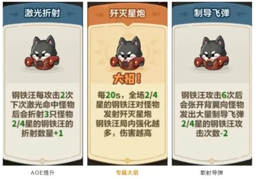 【歼灭星炮(大招)】:每隔20秒,场上星级为2星或4星的钢铁汪会向怪物发射歼灭星炮,对直线上的目标造成伤害。(钢铁汪在游戏对局内获得的强化程度越高,所造成的伤害就越高)