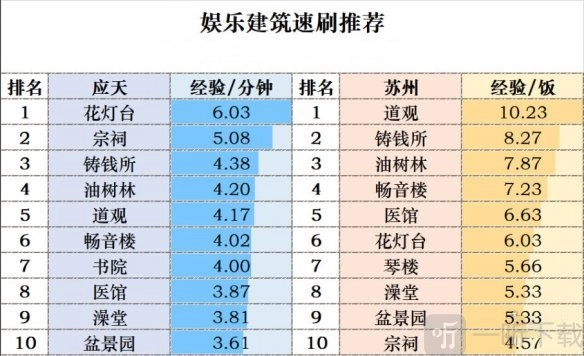 (按照每个建筑的每分钟经验速度排序)