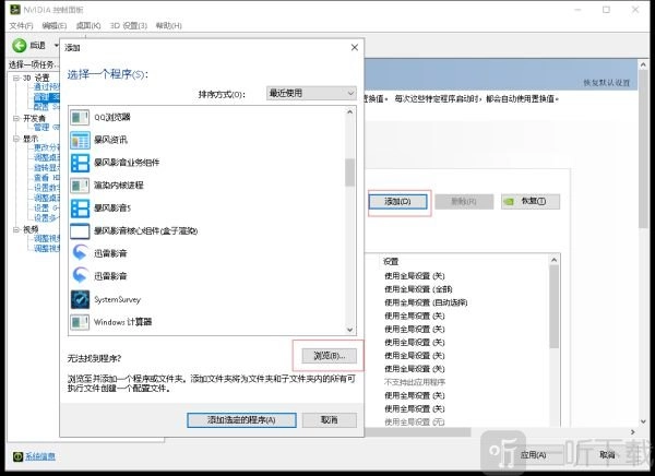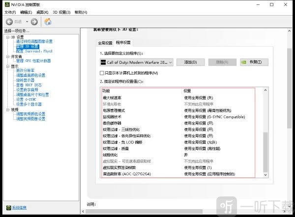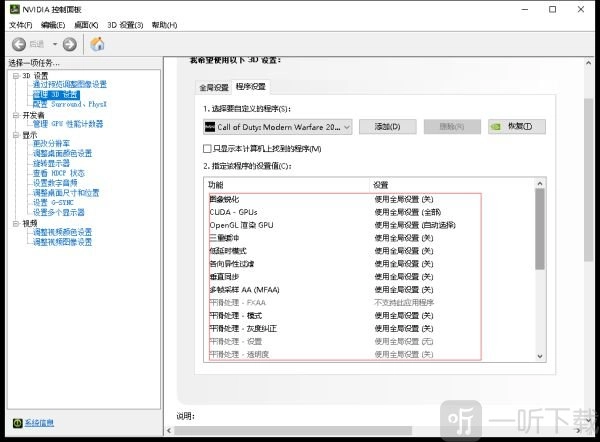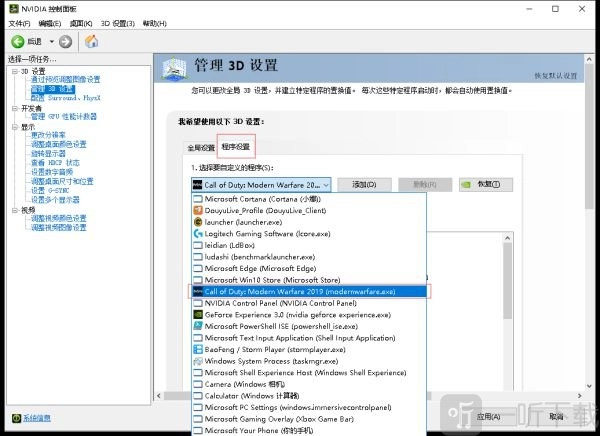 (3)在“管理3D设置”的程序设置里,于“选择要自定义的程序”处选中《使命召唤16》游戏程序。要是没有该程序,可点击“添加 - 浏览”,在游戏安装文件夹中找到《使命召唤16》游戏程序并添加,随后依照以下图片进行设置。
