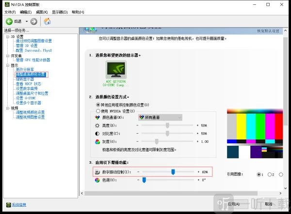 (4)第三项“显示”中的“调整桌面颜色设置”,将“数字震动控制”调整到60%-70%之间,不建议调的过高,看时间长了眼睛会不舒服;