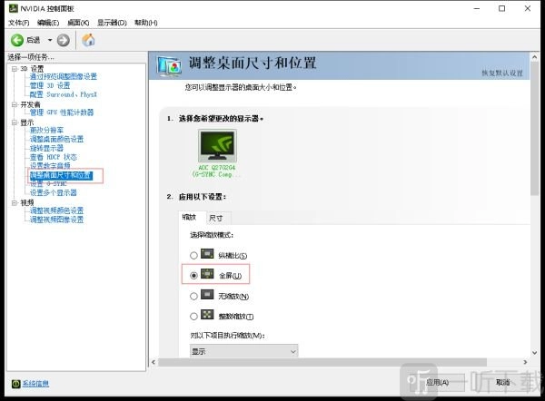 (5)“调整桌面尺寸和位置”-缩放中选择“全屏”