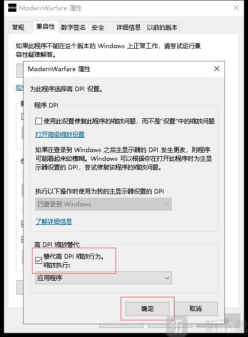 (3)在游戏安装目录里找出这两个游戏程序文件,右键单击它们,选择属性,找到“兼容性”选项卡,勾选“禁用全屏优化”与“以管理员身份运行此程序”;接着点击“更改高DPI设置”,在“替代高DPI缩放行为”前打上√,最后点击确定。