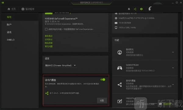 (2)安装完成后检查更新一下驱动程序,确保显卡驱动是最新版的,点击设置,在“常规”标签中找到“游戏内覆盖”,打开开关即可关闭此程序。