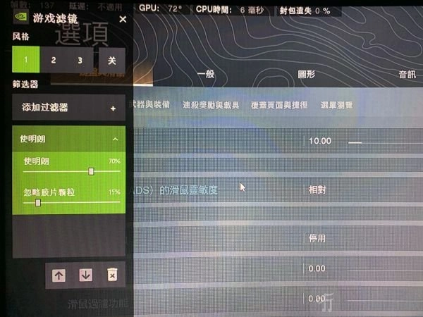 (3)关闭游戏并重新启动,进入游戏后按下Alt+F3以激活NVIDIA游戏滤镜。在“风格”下方,选择“标签1”。于筛选器里找到“使明朗”,将其调节至70%,同时把“忽略胶片颗粒”调整为15% 。
