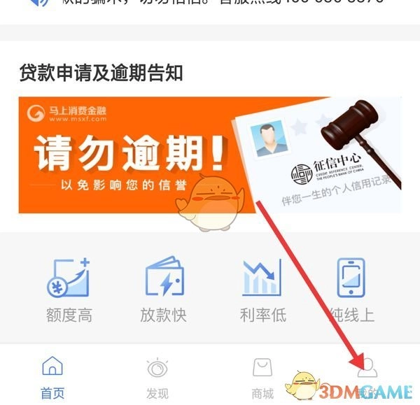 1、第一步,打开马上金融APP。接着,在主页面找到“我的”选项,并点击它。