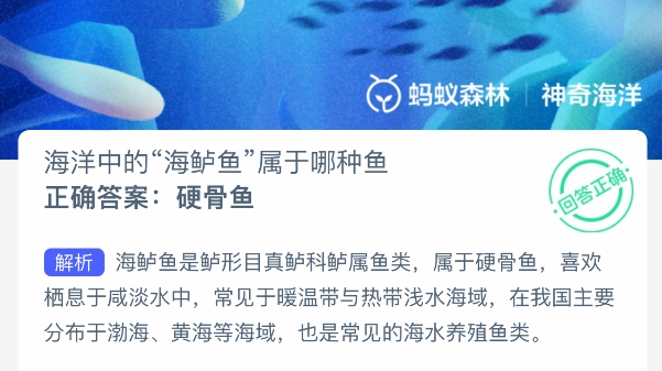 2025年4月16日,支付宝蚂蚁森林神奇海洋的问题更新啦。今日题目为:海洋中的“海鲈鱼”属于哪种鱼?正确答案是:【硬骨鱼】。海鲈鱼隶属鲈形目真鲈科鲈属,属于硬骨鱼类,偏好栖息在咸淡水里,在暖温带与热带的浅水海域较为常见。