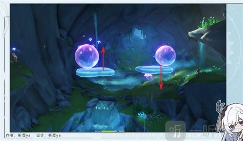7、当水泡与簧管处于同一高度,且右边平台正在下降时,玩家可利用弓箭射击左边的水泡(正常情况下右边的水泡会被波纹引爆,若未引爆则补射一箭),之后引导第三个仙灵。