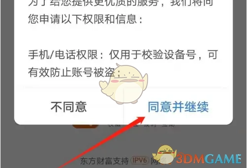 1. 开启“东方财富”APP,按照页面提示点击“同意并继续”。