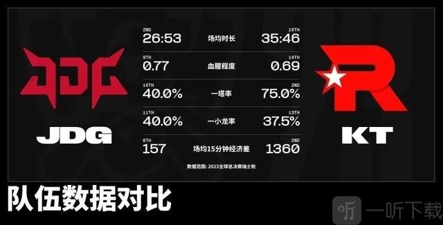此次对决的两支队伍颇具看点。JDG堪称今年BO5赛场上的不败战神,而KT在瑞士轮的表现也极具含金量,与LPL四支种子队伍均有交手,胜负参半。从赛前数据而言,JDG在世界赛的三场比赛耗时都极短,在S13赛季的十场BO5中更是未尝败绩;反观KT,其场均15分钟的经济差优势明显,前期进攻锋芒毕露。