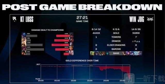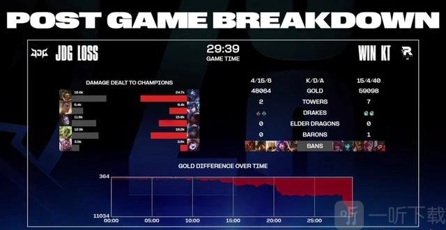 在第一局比赛的前10分钟,两队战况胶着,你来我往,均未能将优势转化为胜势。比赛进入15分钟后的中期阶段,KT凭借运营节奏,取得近2000的经济领先,还成功控下前两条小龙。第23分钟左右,比赛迎来转折点,两队在小龙处爆发团战,JDG匆忙先手开团,却遭到KT的迅速反打,KT打出0换4的战果,打破场上僵局,进而开始滚雪球式的推进。最终,在29分39秒,KT抱团拿下大龙,回头接团又打出0换5,团灭JDG,先下一城!