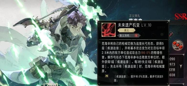 范海辛,作为教会阵营中不可或缺的一员,其自身定位为轻型角色,月相为满月,他拥有着一种神秘而强大的能力,这种能力使得他在面对单体目标或者小范围的敌人时,可以给予敌人持续且大量的伤害,因为他的奥义技能未来遗产机变,战斗效果很不错,当范海辛施展这个技能时,他手中的枪械在瞬间迅速切换成追猎长弓形态,与此同时他获得了5层极速追猎的效果,这一效果的加持让他的基本攻击发生了翻天覆地的变化。