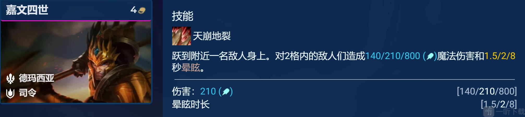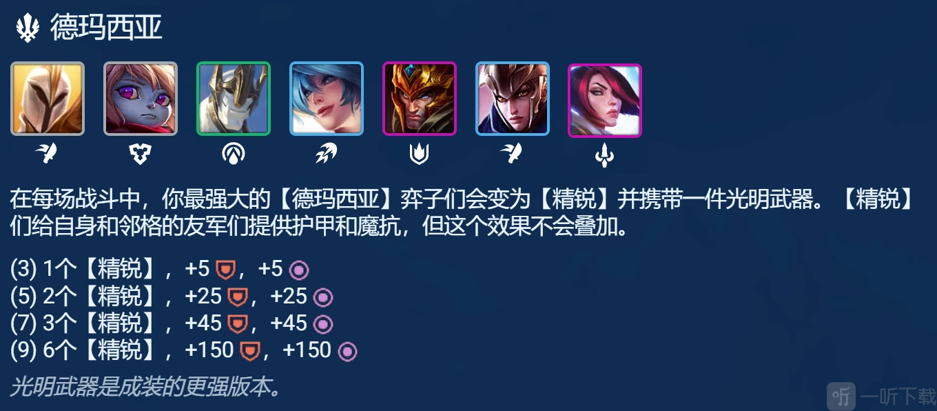 7德玛西亚羁绊的精锐不仅能获得45的双抗,还能为站在附近一格内的棋子提供这个加成(相当于全员4堡垒),最重要的是还能多3件光明装备。