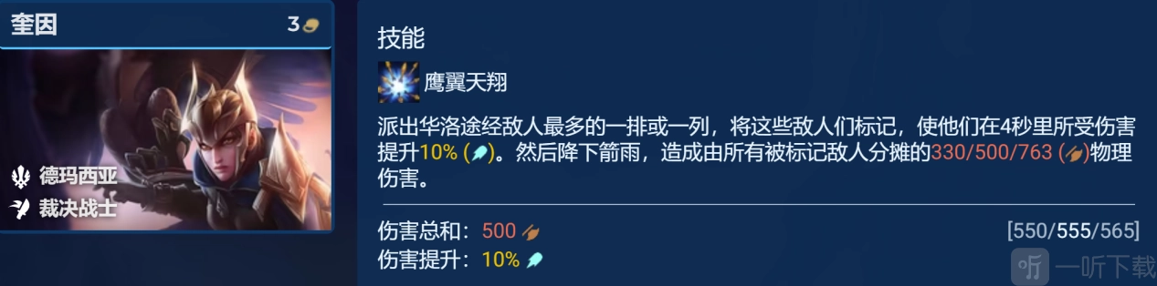 阵容中的主C奎因,在配备德玛西亚精锐后,可免费获取一件光明装备——光辉之刃。这件装备能显著提升攻击力。尤其是当奎因达到3星,且搭配轻语、无尽之刃与光辉之刃时,攻击力可高达310。释放技能后,能打出1700+的物理群体伤害,技能暴击伤害更是可观。此外,阵容激活了4裁决战士羁绊,能为奎因提供20%的额外伤害。同时,被奎因技能标记的敌方单位,在4秒内还需额外承受10%的伤害。在多种属性的强力加持下,奎因的输出堪称恐怖。
