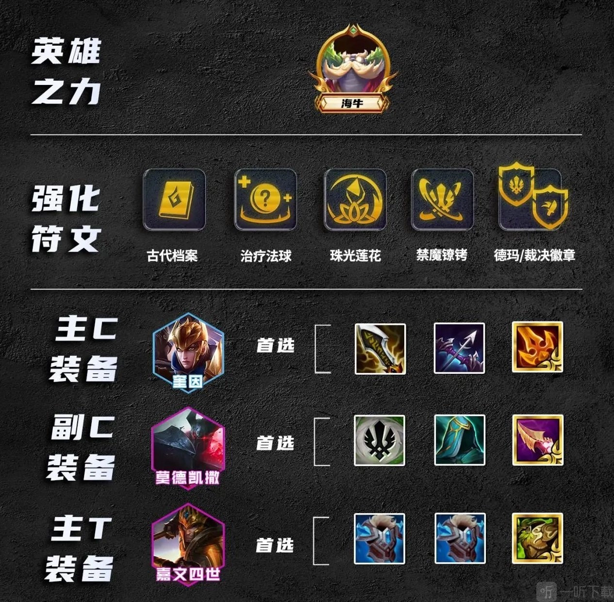 在英雄之力的选择上,我们一般推荐海牛。海牛的首个符文古代档案相当实用,不仅能获取一本纹章之书,且有一定概率开出德玛西亚/裁决使转职,同时还会提供3金币,这在很大程度上提升了我们前期的经济状况以及阵容所能达到的上限。