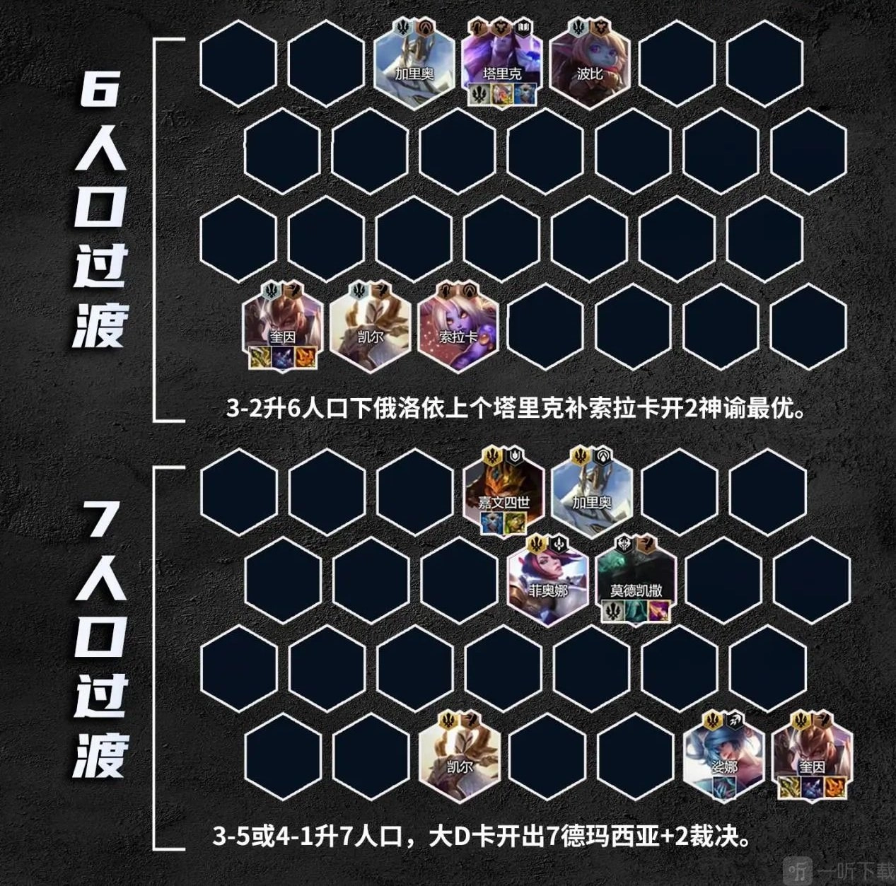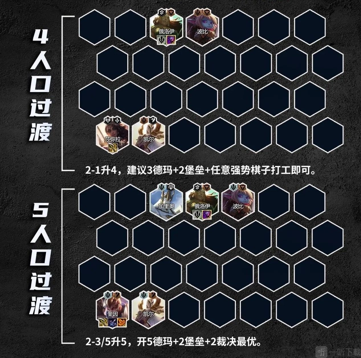 2-1升4,2-3/5升5建议3德玛+2堡垒+任意强势棋子即可,5人口开5德玛+2堡垒+2裁决,没5德玛添加强势棋子即可,装备优先做无尽之刃+轻语。