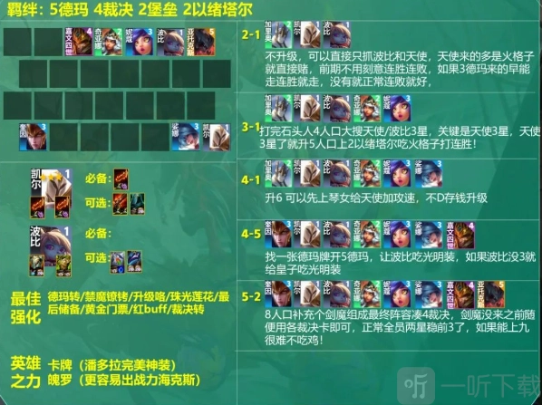2、阵容羁绊配置:包含5个德玛西亚英雄,激活4裁决战士羁绊,同时具备2堡垒卫士与2以绪塔尔羁绊效果