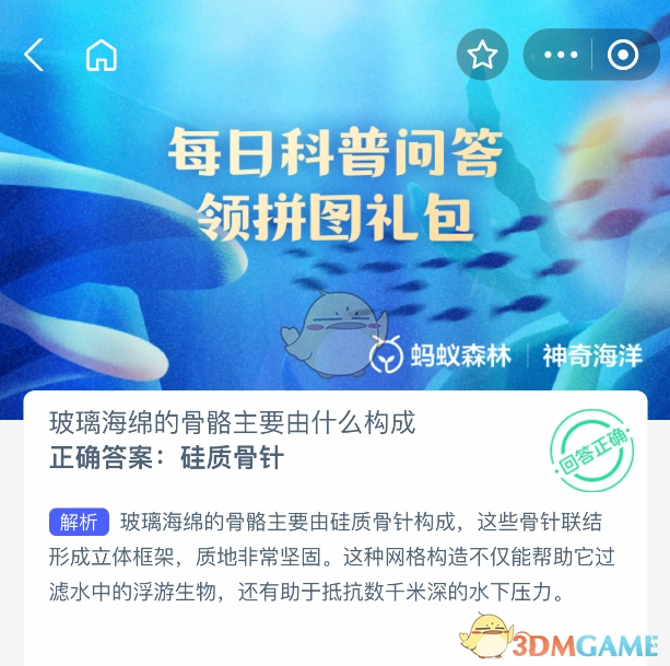 2025年6月11日,支付宝蚂蚁森林神奇海洋的问题已更新。今日题目为:玻璃海绵的骨骼主要由什么构成?正确答案是【硅质骨针】。玻璃海绵的骨骼主要由硅质骨针构成,这些骨针相互联结,形成了立体框架,质地极为坚固。