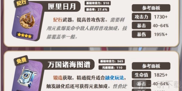莱欧斯利触发融化反应后,自身冰元素伤害会得到提升。在游戏的前中期,万国诸海图谱是性价比相对较高的武器选择。而匣里日月这把武器,莱欧斯利需要先前置施放元素爆发,才能触发其对普通攻击伤害的加成效果,并且该加成时间无法覆盖莱欧斯利的整个输出过程。
