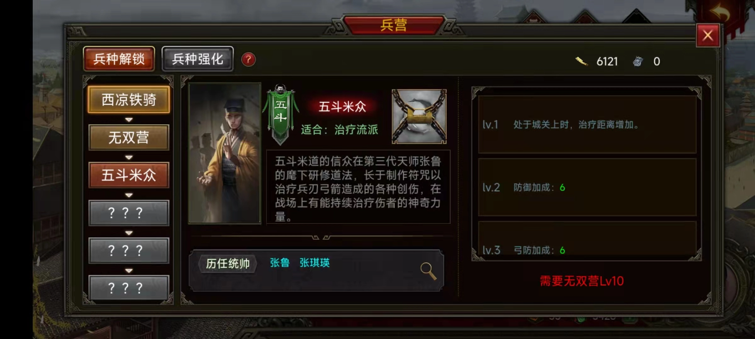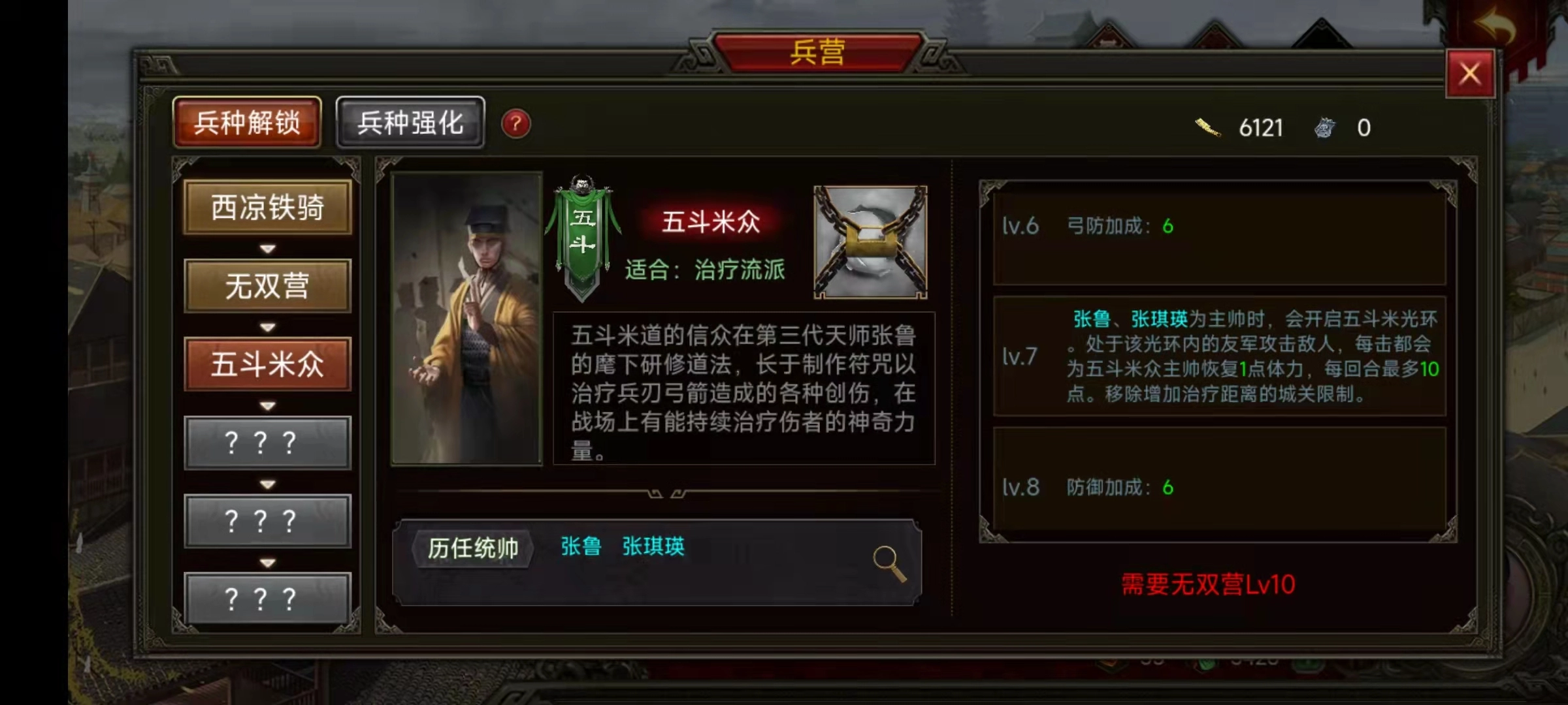 五斗米众依旧按顺序解锁,主公得先解锁西凉铁骑和无双营,方可解锁五斗米众。