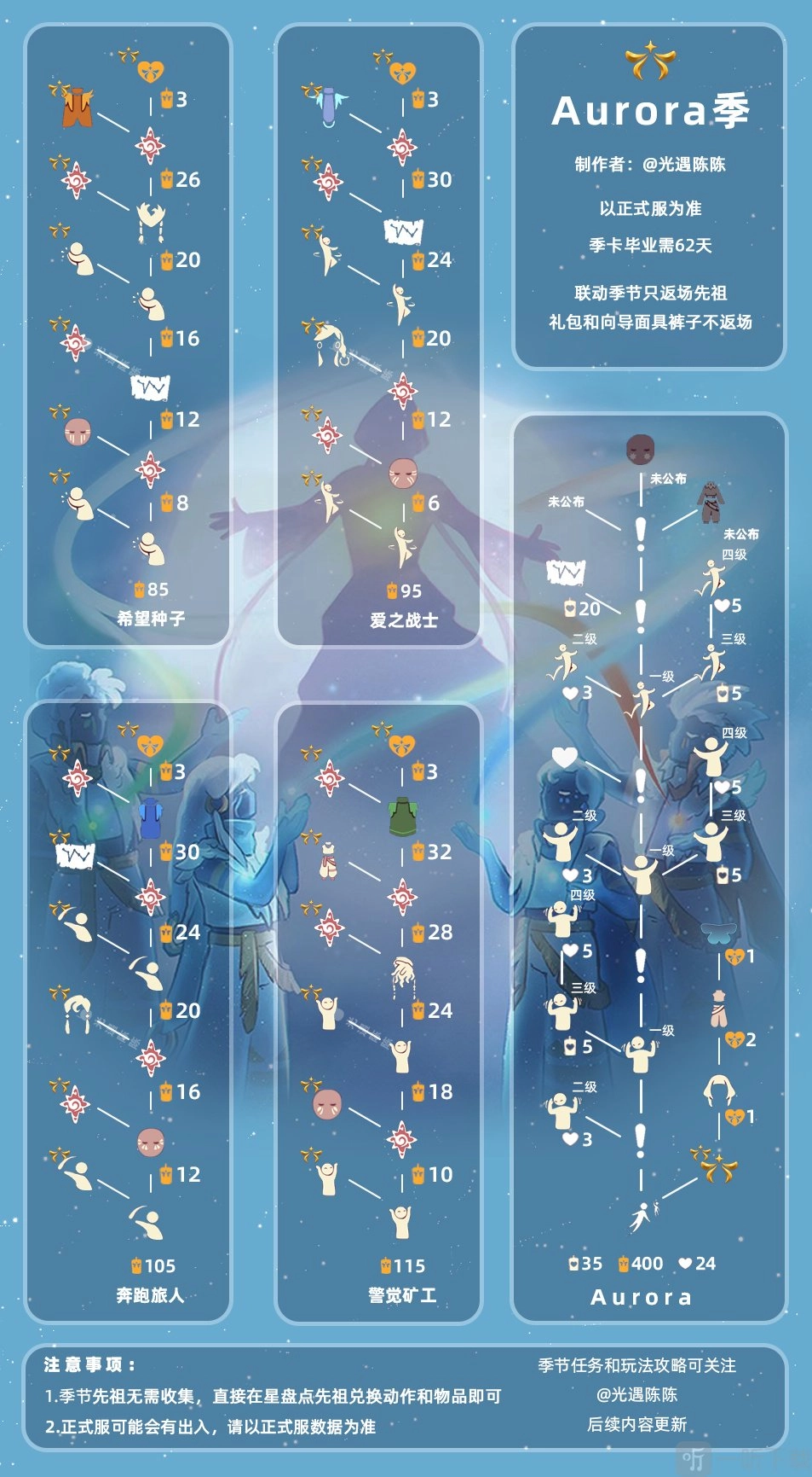 2、欧若拉作为联动季节,若想毕业,大约需要62天,兑换物品需耗费400根蜡烛。