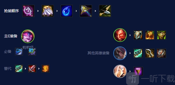 莉莉娅的出装顺序,首先选择离子火花和巨杀,第三件装备补充具有回复效果的装备。所有肉装都分配给布隆,其余的输出装则给到皎月。