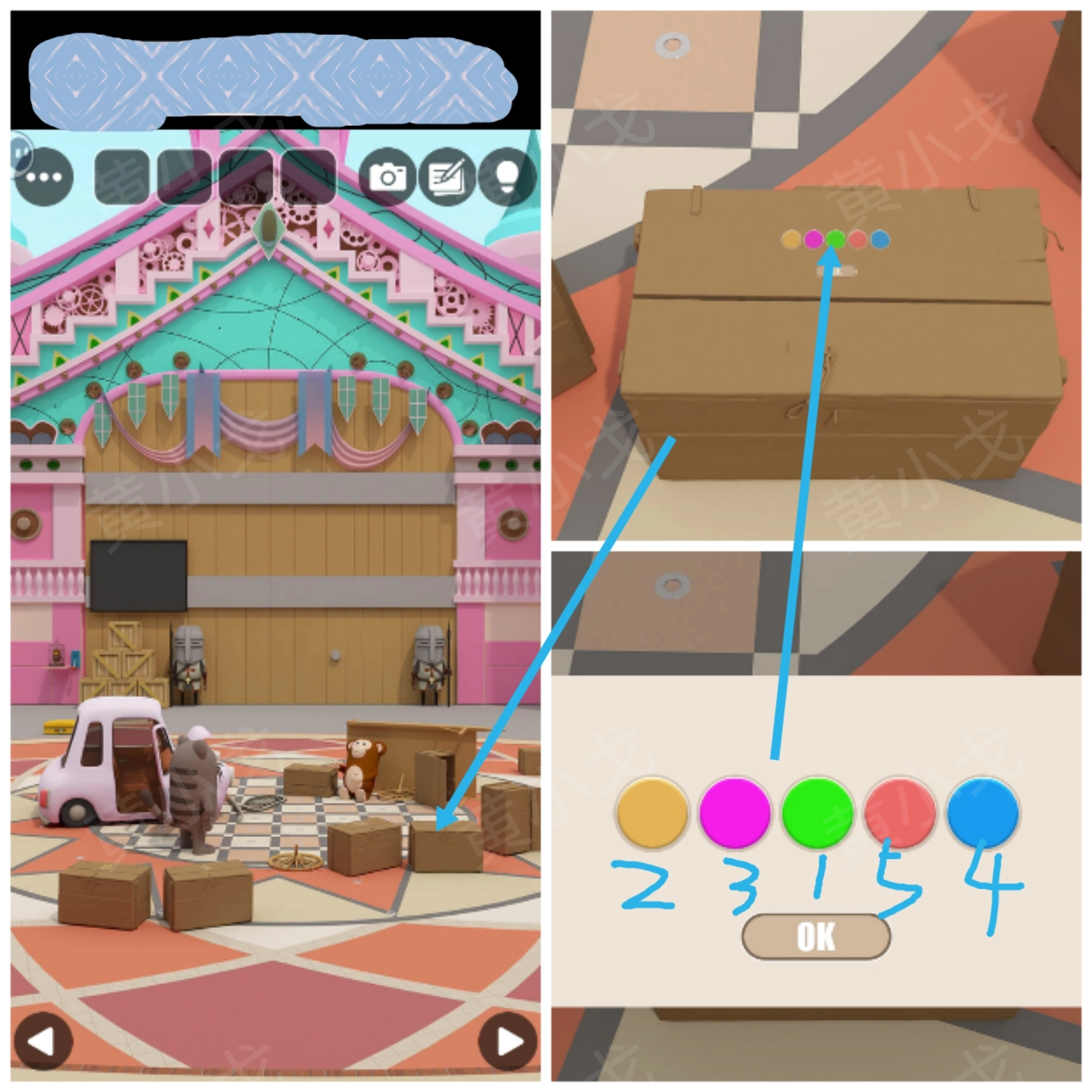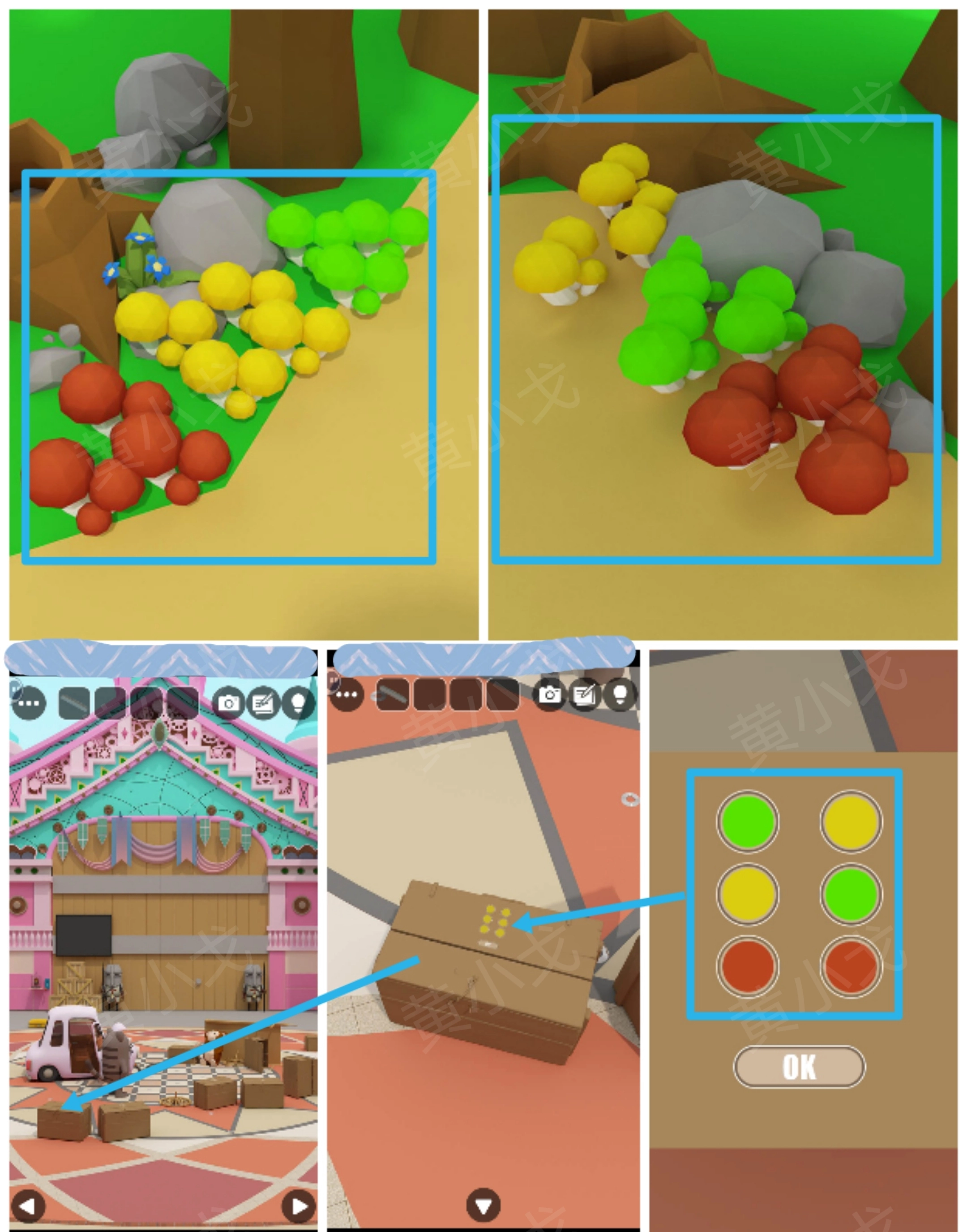 1. 轻点位于地面的首个箱子上的密码锁,依据[树林]场景里蘑菇所提供的线索,对密码锁进行调整