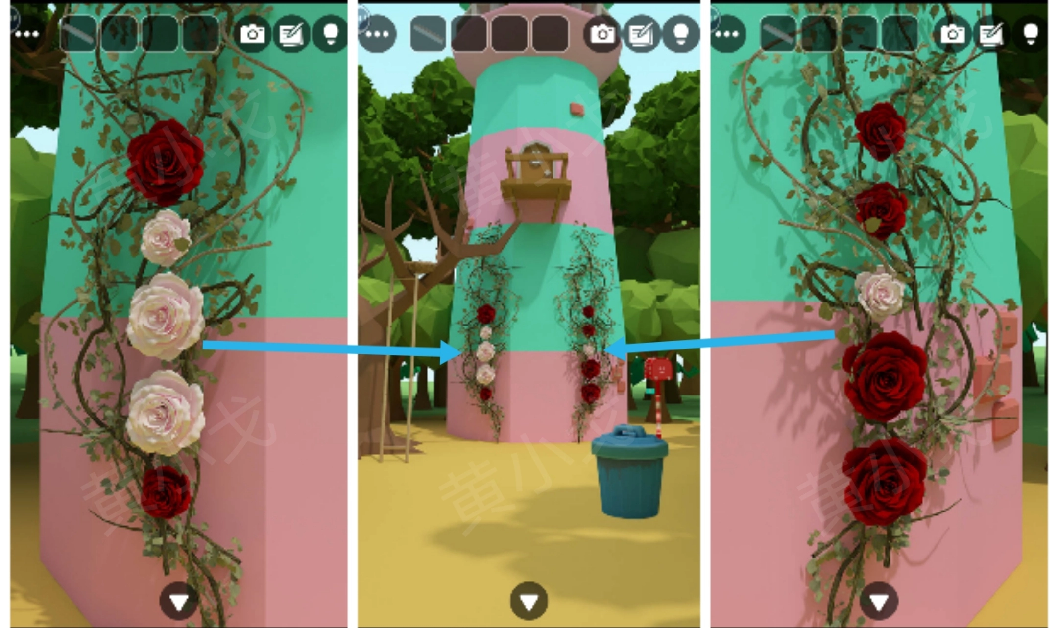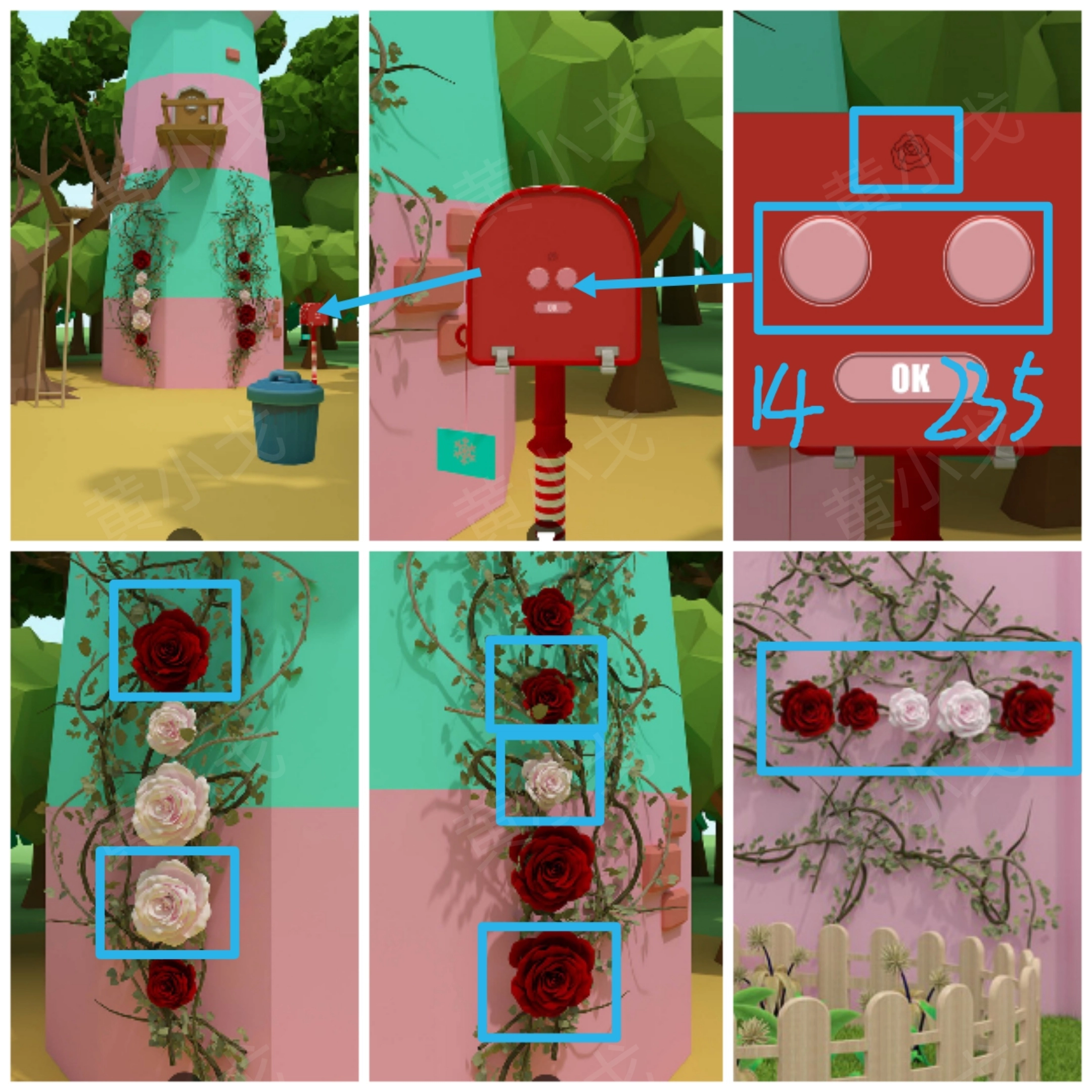 5. 轻触邮筒上的密码锁,依据其上蔷薇图案给出的提示,综合此场景墙壁上以及[儿童区]场景墙壁上的蔷薇线索,按先后顺序按下按钮。
