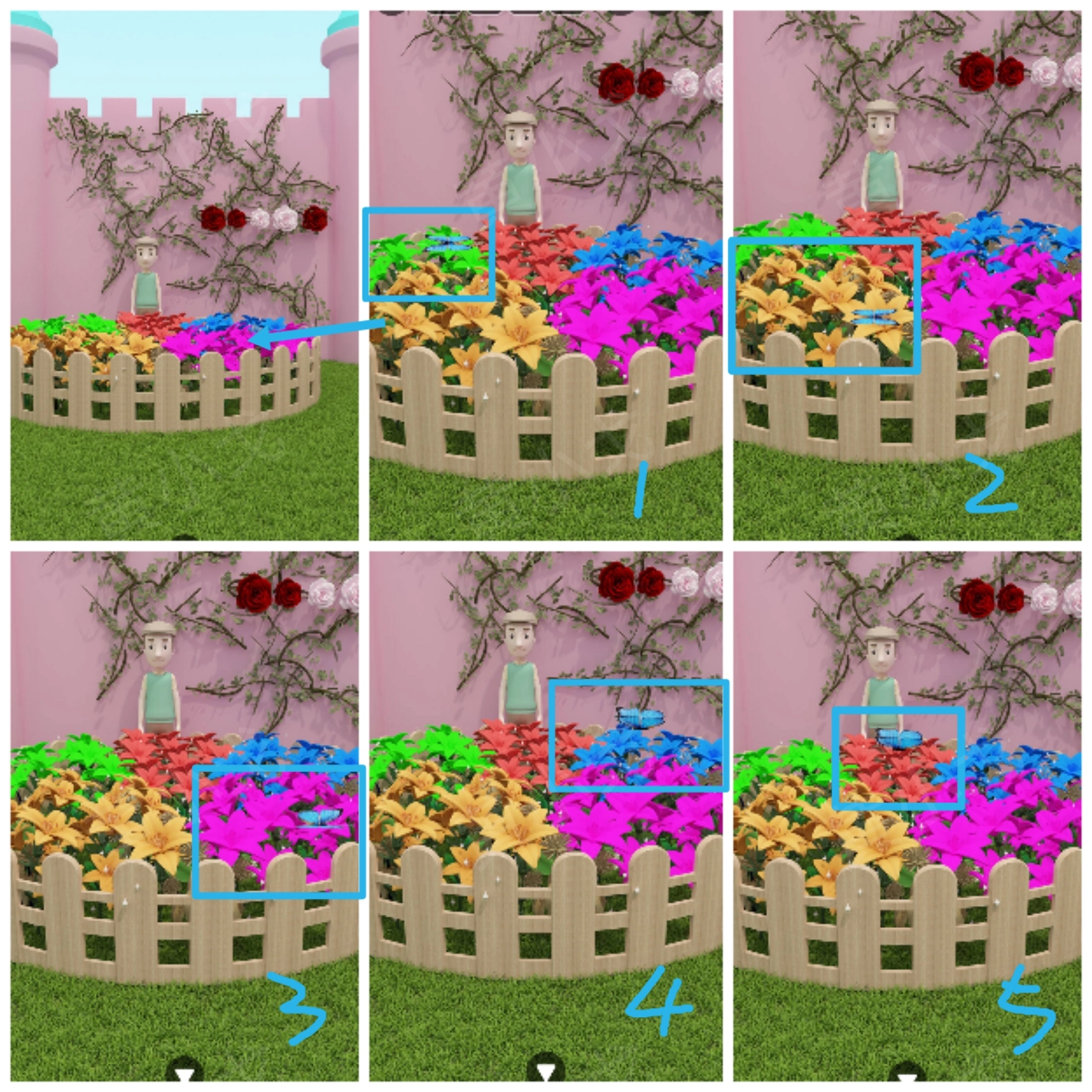 17. 轻点地面上第四个箱子的密码锁,依据[儿童区]里蝴蝶停留在花朵上所呈现的线索,依序按下按钮。