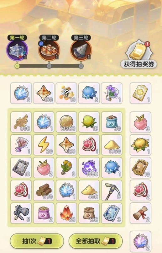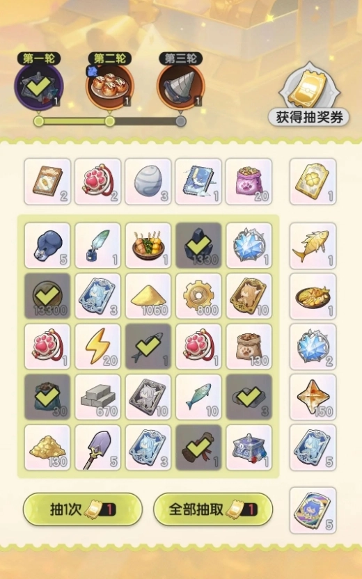 每当玩家完成一张宾果盘,游戏便会即刻刷新出下一张宾果盘,方便玩家接着抽取。如此循环,直至所有宾果盘都被玩家抽取完毕,或者活动宣告结束。宾果盘里的奖励极为丰富,几乎囊括了人们养成角色所需的所有资源,像宝石、材料之类,这能有效减轻人们在养成角色过程中的资源消耗压力。