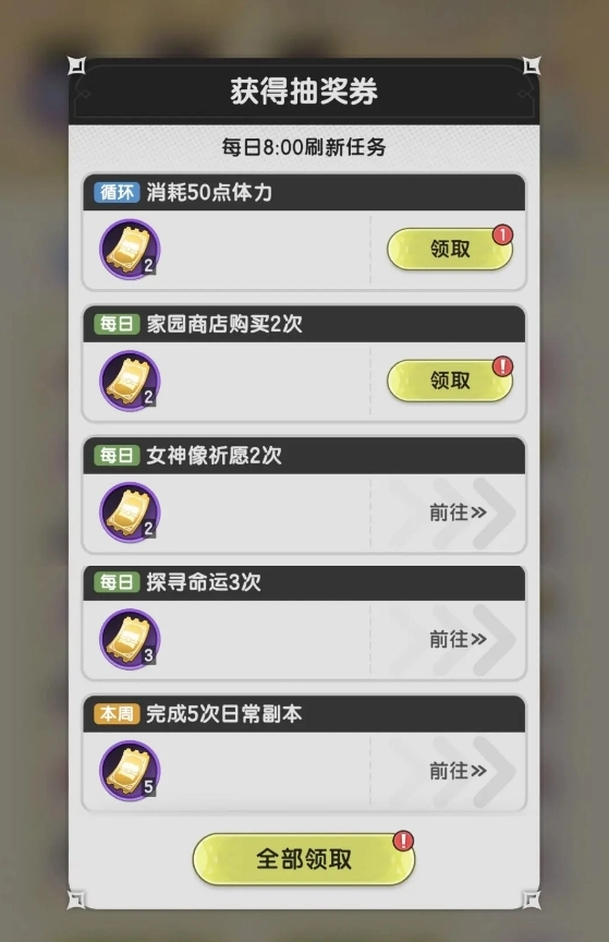 抽奖券的获取方式主要依靠完成每日的奖券任务,这些任务会细分为多个不同的小任务。每完成一项,就能获得数量不等的奖券用于抽奖,当日全部任务完成后便无法再获取奖券。不过,游戏中玩家通过免费途径拿到的抽奖券,足够抽完所有奖励,甚至还会有剩余。所以,只要每天坚持完成奖券任务,就无需担心拿不全奖励。