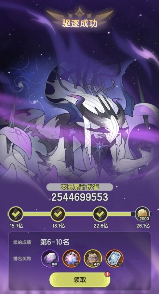 混沌侵袭为玩家带来的奖励主要有两类。其一为驱逐奖励,全服所有参与活动的玩家均可获得。当活动累积的伤害数值达到特定阶段,就会解锁相应阶段的奖励,并发放给玩家。其二是个人奖励,依据输出排名进行发放,不同名次的玩家获得的奖励各不相同。