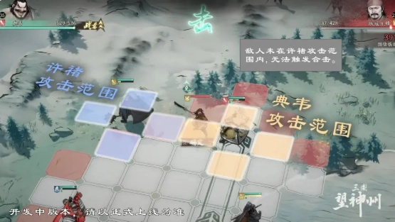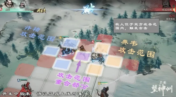 例如,典韦与许褚作为近战主将,其攻击范围呈正十字形一格,能够将敌人直线包夹在他们二者的攻击范围内,进而形成合击。