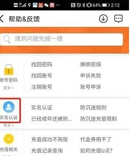 3、点击进入帮助反馈页面,找到实名认证选项并点击。