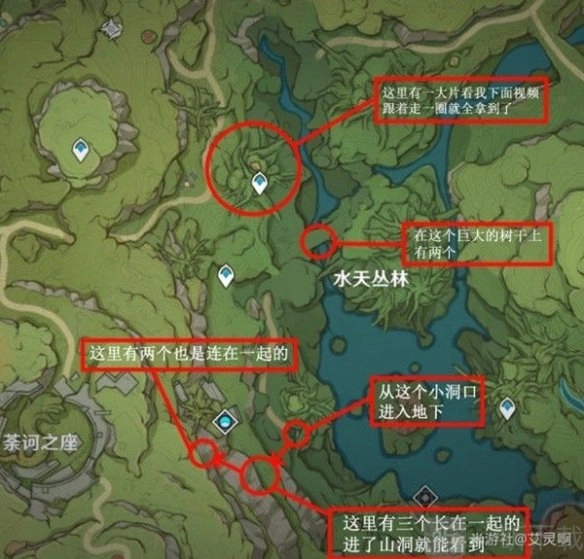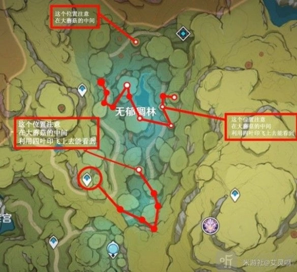 首先抵达无郁稠林(图中带有白色标记之处,皆位于大蘑菇的中间夹层里)
