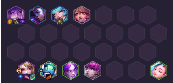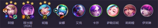 此阵容以阿狸为核心主C,配合阿卡丽高爆发单点收割,以及娑娜、萨勒芬妮等提供团队辅助与输出,后期形成技能连发压制节奏。