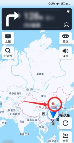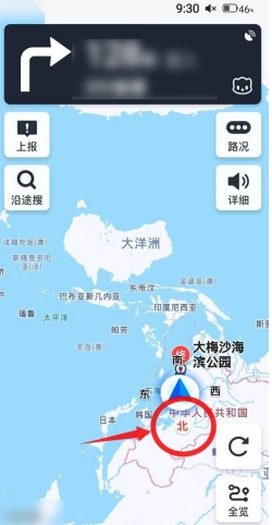 1. 查看高德地图首页左上角的罗盘,其中红色所指方向为北,与之相对的方向是南。