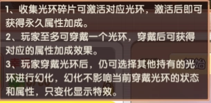 2. 每位玩家最多仅能穿戴一个光环,一旦穿戴,即可获取与之对应的属性加成效果。