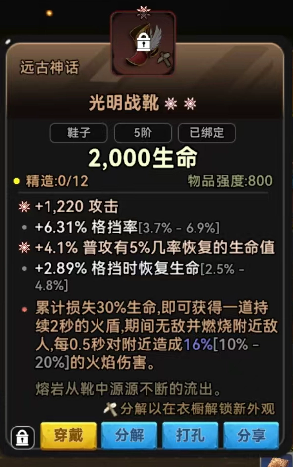超实用保命装备,血量每降至30%,即可触发一次无敌效果,实力强劲。装备自身还带有面板伤害词条。