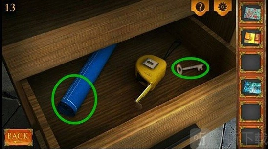 3、使用钩子把右侧桌子下方的抽屉钩开,从中获取蓝图与钥匙。