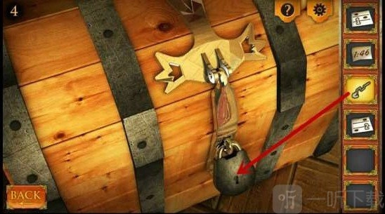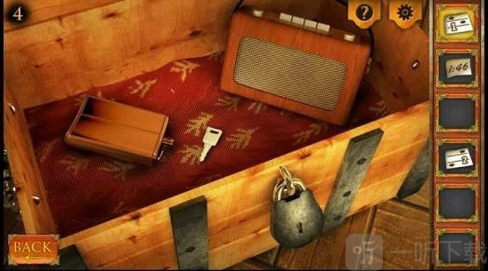 6、找到最左边的箱子并点击,接着用别针把箱子的锁打开。打开箱子拿到两张纸,按照纸上的提示去调节机关:第一个机关和第四个机关调至最上面位置,第二个机关调至中间位置,第三个机关调至下面位置。