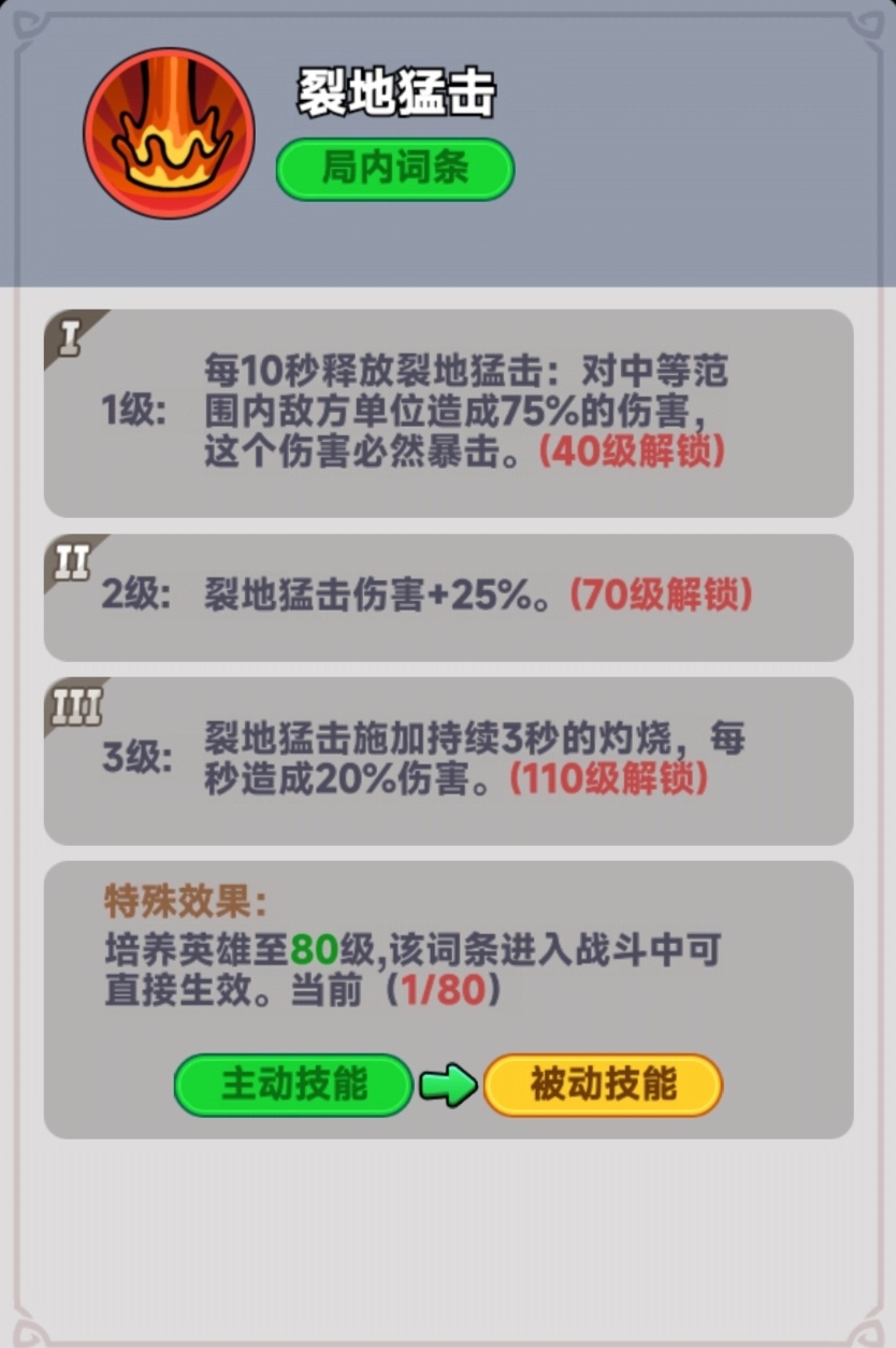 三技能:裂地猛击,这是一个主动战法。每隔10秒就会释放一次技能,能造成范围伤害,并且该伤害可以产生暴击,伤害效果非常高。当技能提升到二阶时,伤害会再次提升至1.5倍,但角色需要达到70级才行。咦,不对呀,我干嘛要去考虑那些氪金大佬有没有钱氪的问题呢。