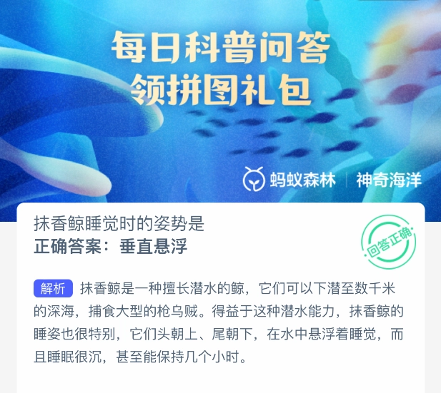 2025年6月23日,支付宝蚂蚁森林神奇海洋的问题已更新。今日题目为:抹香鲸睡觉时的姿势是?正确答案是:【垂直悬浮】。抹香鲸是一种很会潜水的鲸,能够下潜到数千米深的海域,以捕食大型枪乌贼。