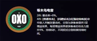 2、啄木鸟电音1、2件:暴击率提升8%。2、4件:当装备者的[普通攻击]、[闪避反击]或[强化特殊技]命中敌人并触发暴击时,会分别为自身叠加1层增益效果;每层增益可让攻击力提高9%,效果持续6秒,且不同招式触发的增益持续时间独立计算。