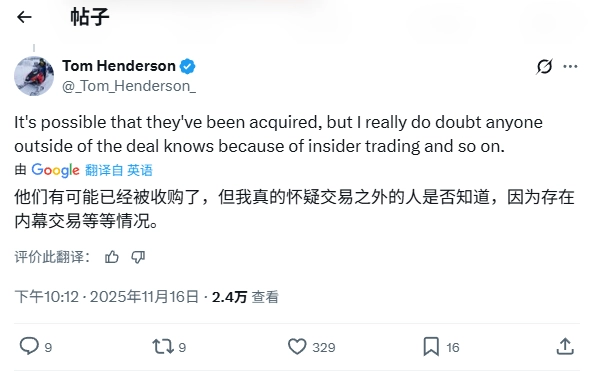 知名爆料人Tom Henderson同样在评论区回应称:“或许他们已被收购,不过我实在怀疑,除了交易相关人员外,是否还有人知晓此事,毕竟这涉及内部交易等方面的因素。”
