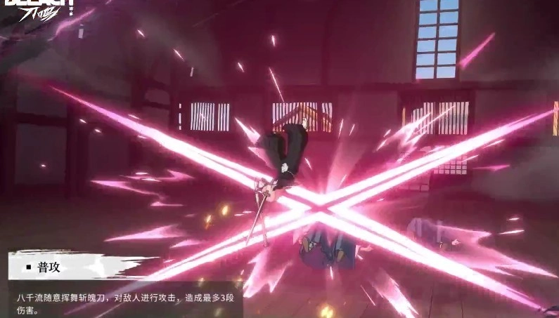 草鹿八千流的普通攻击是三段式的连续斩击,这是她在场上实现基础输出的主要方式。这个技能的动作十分流畅,能够快速地衔接其他技能,无论是在常规对战中,还是在连招起手的阶段,都有着较高的实用性。虽然它单次造成的伤害不算特别突出,但搭配后续的技能切换,能够有效地加快整体输出的节奏。