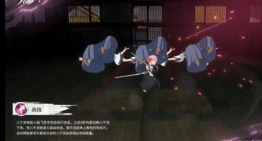 释放战技后,草鹿八千流会先把目标挑至空中,紧接着追加一次强力斩击。这个技能的核心作用并非仅仅是输出伤害,关键在于触发它的后台增益机制。建议在技能释放后的3秒内快速切换角色下场,只要进入观战状态,就能为当前在场的队友提供攻击力加成。另外,当队友进行普通攻击或分支攻击时,草鹿八千流还可以持续积累必杀技能量,从而达成资源的循环利用。