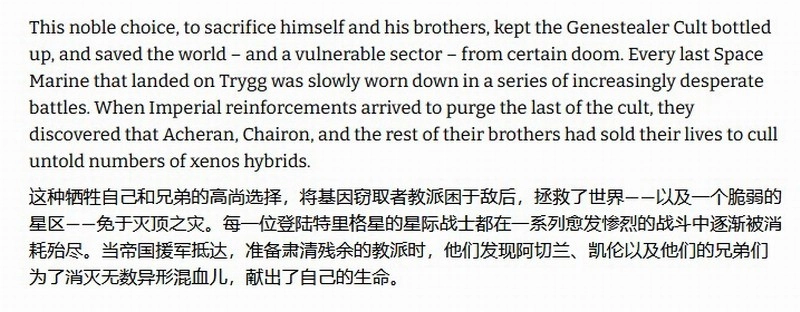 在战锤官方网站后续发布的一篇设定更新里提到,阿切兰壮烈牺牲。另外,那位曾在游戏中与泰图斯并肩战斗至最后的硬汉梅杜拉斯·凯隆,也已被证实牺牲。根据官方的描述,他们是在巢都星球特里格清剿基因窃取者教派的行动中不幸阵亡的——当增援部队抵达时,他们已然用自己的生命消灭了不计其数的异形。