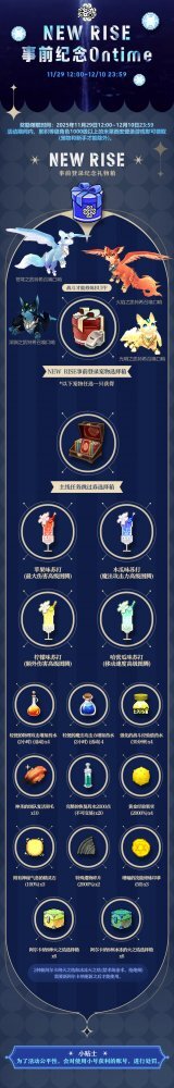 为了纪念即将上线的NEWRISE版本,11月19日12:00至12月10日23:59期间,只要登录爱琳世界就能领取丰厚奖励。